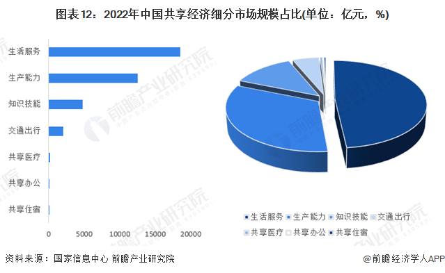 据国家信息中心发布的《中国共享经济发展年度报告2023》,从市场结构上看,生活服务、生产能力、知识技能三个领域占据中国共享经济市场规模的前三。其中,生活服务占据最大比例,2022年市场规模达到18548亿元,占比为48%。