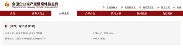 2月26日,全国企业破产重整案件信息网显示,天涯社区网络科技股份有限公司新增一则破产审查案件,申请人为张鑫,办理法院为海南省海口市中级人民法院。