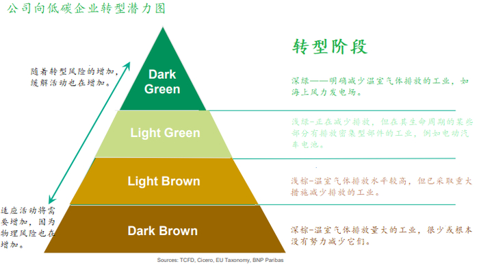 法巴银行预计转型债券将成为未来十年帮助减少温室气体排放的关键工具之一。然而,可以观察到深褐色的公司比绿色的公司承担更大的风险(上图)。