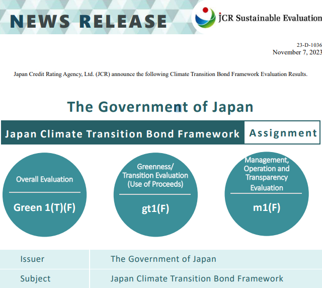 2023年11月7日,日本政府制定了“气候转型债券框架”,这是全球第一个政府标记的转型债券,将作为“日本气候转型债券”发行。