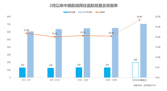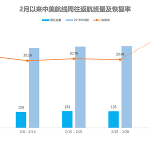 第三方出行平台“航班管家”DAST数据显示,目前,中美实际执行的航班量为每周66班(1个往返计算为1班),其中中方航司执飞35班,美方航司执飞31班。2月以来中美航线恢复率在20%左右。预计增班后中美航线周往返航班量将恢复至2019年的28.4%。
