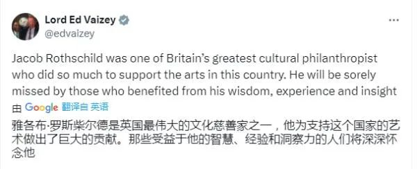 英国前文化部长爱德·韦兹在X上向罗斯柴尔德致哀,称他是英国最伟大的文化慈善家之一。
