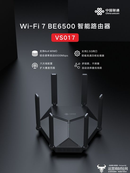 路由器作为家庭网络连接和重要核心,在家庭组网中承担着连接终端设备、提供网络传输和网络管理等功能,产品也在逐步迭代升级。频段聚合、畅享高速,中国联通VS017集成Wi-Fi7特色功能,邀您共同进入Wi-Fi7时代,开启新的终端体验。展望未来,中国联通将持续加强同产业链、行业合作伙伴的合作,发挥自研能力优势,打造规模化、特色化的高品质自主品牌终端。