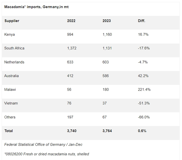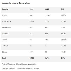 肯尼亚和南非是德国进口夏威夷果最重要的供应国。2023年德国进口带壳澳洲坚果3764吨。肯尼亚以1160吨的产量排名第一,增长了16.7%,而南非则下降了17.6%,下滑到第二位。德国从澳大利亚和马拉维的进口大幅增加。从本季度开始(2023年9月至12月)以来的德国夏威夷果进口量来看,南非目前略微领先。到目前为止,该国向德国供应了598吨,与肯尼亚并肩,肯尼亚在上述期间向德国出口了528吨。