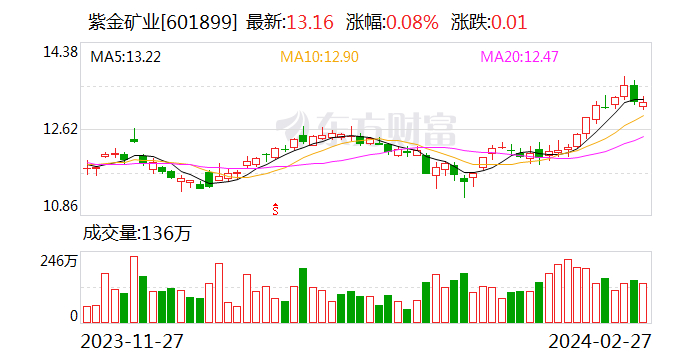 公开资料表明,2023年,紫金矿业铜、金、锌产量分别居全球第5、第8和第4位,其中,矿产铜产量达101万吨,超过了国内当年矿产铜产量的一半;矿产金产量达67.7吨,相当于国内当年矿产金产量的近1/4。
