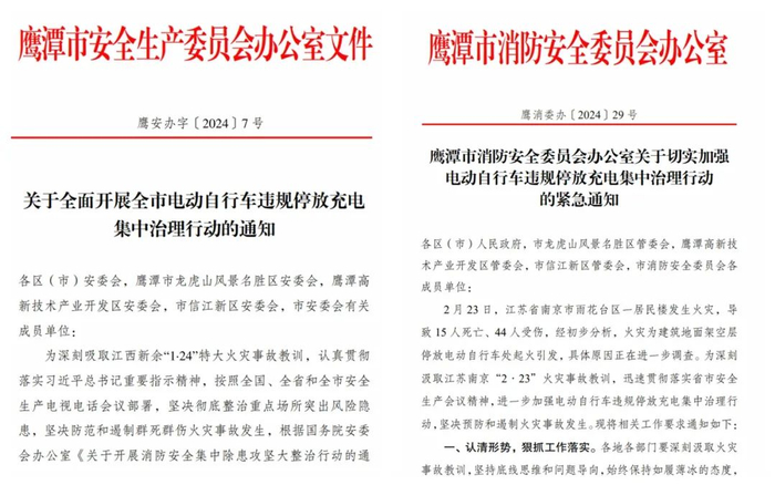 1月30日,2月24日,鹰潭市先后下发《关于全面开展全市电动自行车违规停放充电集中治理行动的通知》《关于切实加强电动自行车违规停放充电集中治理行动的紧急通知》,部署在全市集中开展电动自行车违规停放充电集中治理行动。