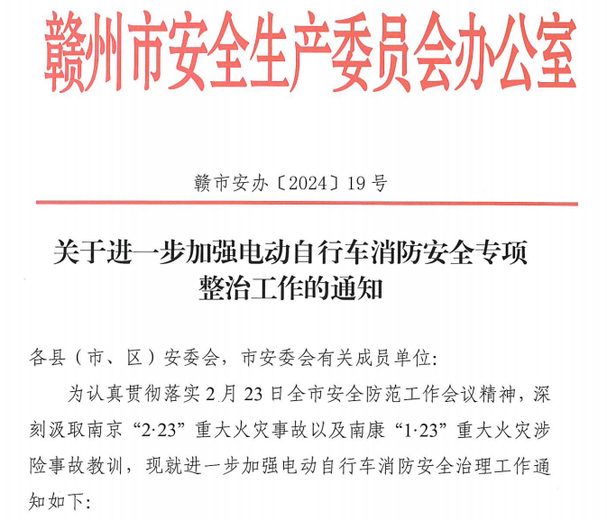 近期,电动自行车火灾事故频发,依据《中华人民共和国消防法》《高层民用建筑消防安全管理规定》《江西省消防条例》等规定,现在全市范围内就进一步加强电动自行车消防安全相关事项公告如下: