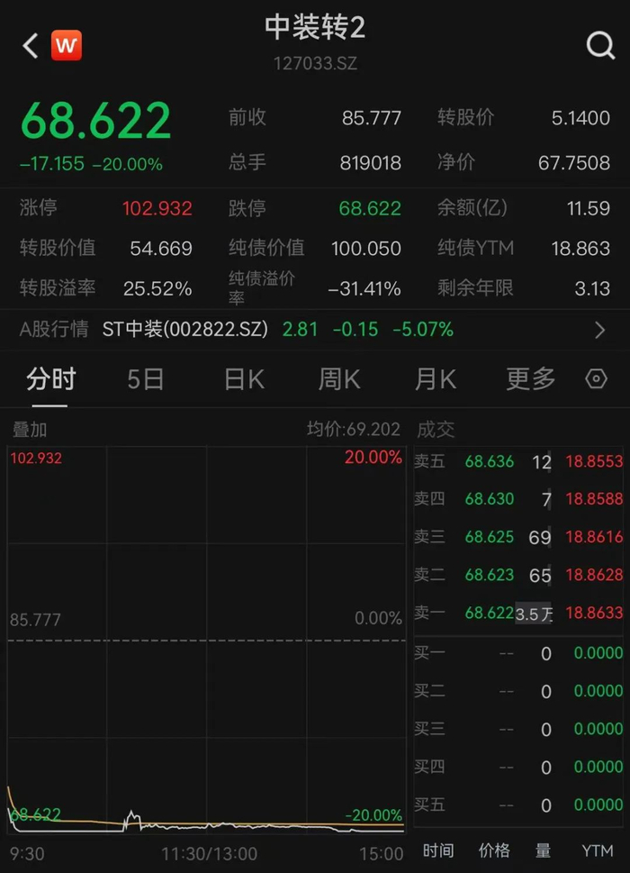 公司股票价格跌停的同时,公司发行的可转债——中装转2也出现跌停。2月27日,中装转2开盘跌14.45%,随后持续下跌并封跌停板,盘中虽实现开板,但随后再次封跌停。截至收盘,中装转2跌20%,报68.622元/张,全天成交额达5.67亿元。