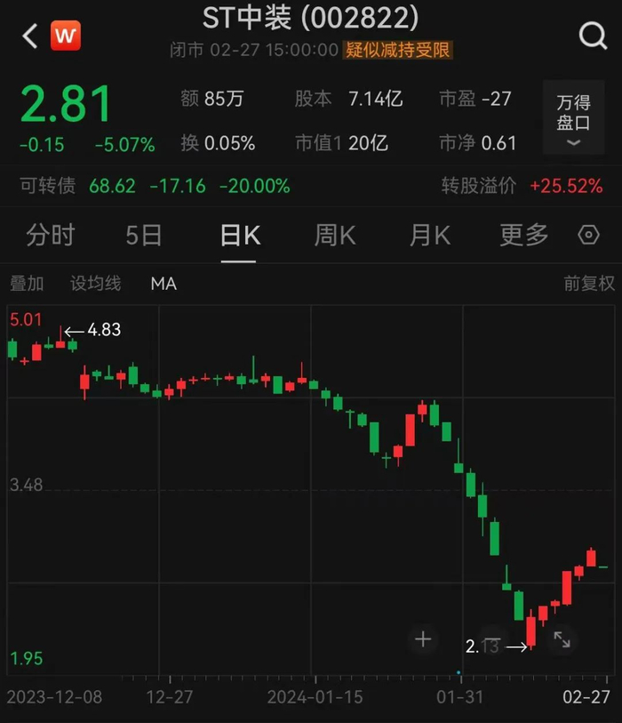 公司股票被实施其他风险警示后,ST中装2月27日一字跌停,跌幅为5.07%,报2.81元,收盘时的跌停封单量仍有82.82万手,相当于2.32亿元资金委托卖出但未成交。