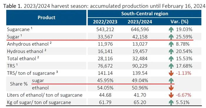 虽然2023/24榨季生产已经接近尾声,但2月上半月(1-16日)巴西主产区(中南部地区)甘蔗产量达到54.9万吨,产糖2.7万吨,上年同期甘蔗产量仅为7.3万吨、产糖量仅为0.2万吨。