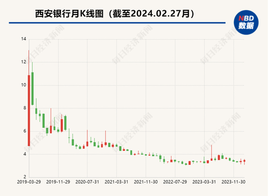 据东方财富Choice统计数据,西安银行自2019年3月上市后,股价在当月曾有过短暂冲高,而后便步入长期下行通道,目前市值为155亿元,相较上市首日约300亿元市值,几乎已是“腰斩”。
