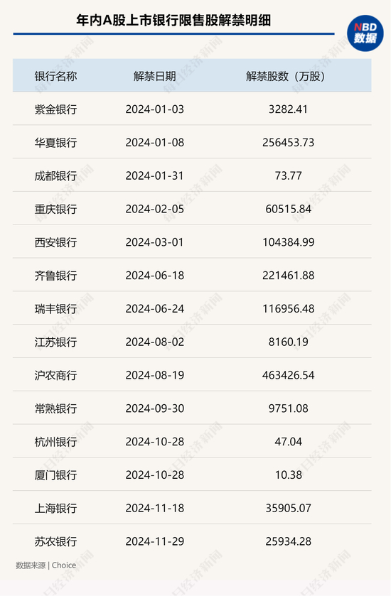 东方财富Choice统计数据显示,2024年,有多家A股上市银行限售股解禁上市。