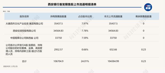 除了上述三位股东合计持有的10.38亿股外,本期还有632.66万股待解禁股来自西安银行IPO前持有公司股份的时任董事、监事、高管以及持有内部职工股超过5万股的人员,占本期解禁股数量的0.61%。