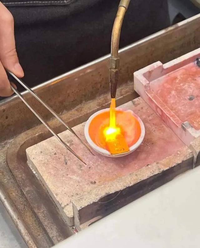 接着,专业师傅就会当着顾客的面,将金首饰熔掉重新锻造成形,整个过程一到两小时,全程在顾客的眼皮子底下,如果顾客想要全程拍照摄影也可以,亲眼看着放心指数拉满。