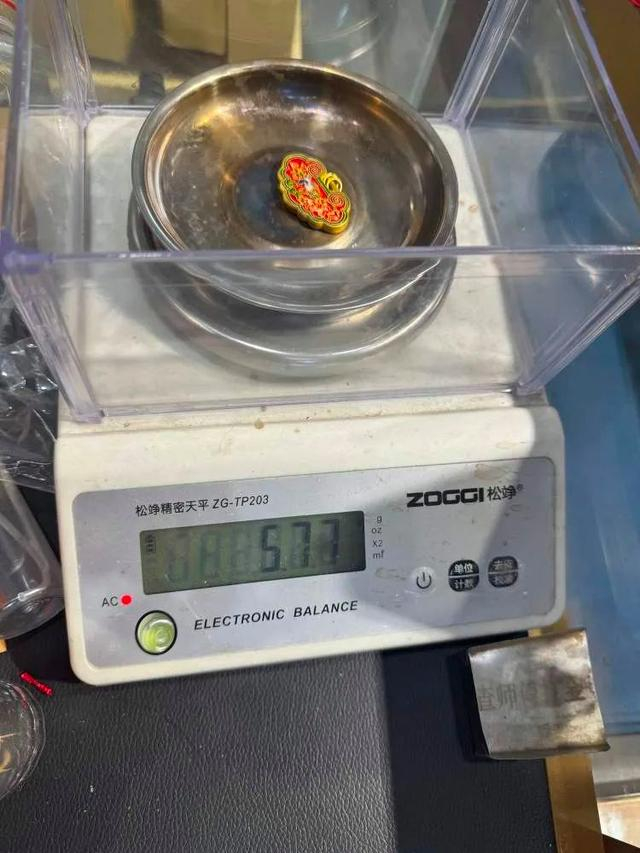 最后,金首饰成功出炉,再称重,如果锻造过程有损耗,则会补给顾客等重的“金豆子”,这点最让顾客们惊喜不已。“打新首饰的过程中,产生了0.57克的损耗,补了我一颗小金豆子。”