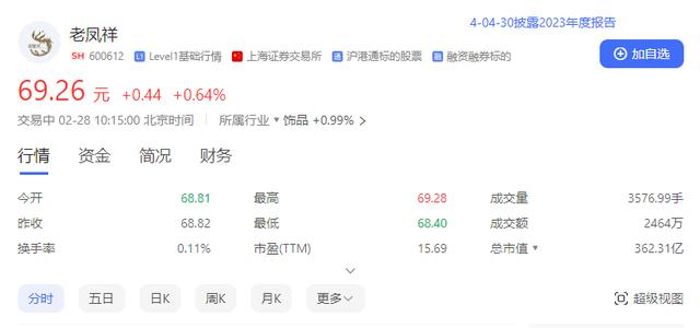 老凤祥的股价从一年前的47.09元/股涨至今日的69.25元/股。市值则从2023年2月20日的253.97亿元涨至361亿元,上涨42.15%。