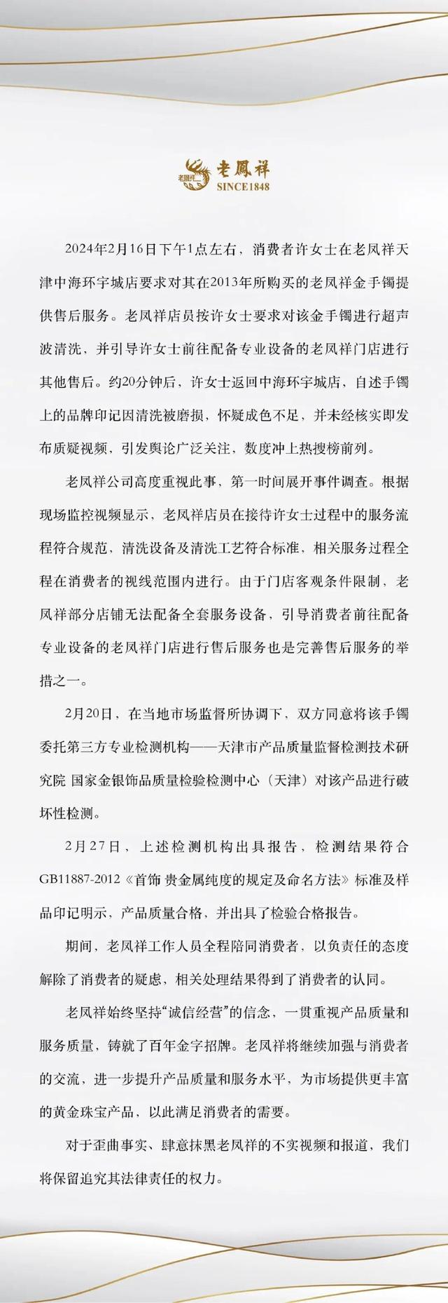 老凤祥表示,2月20日,在当地市场监督所协调下,双方同意将该手镯委托第三方专业检测机构——天津市产品质量监督检测技术研究院 国家金银饰品质量检验检测中心(天津)对该产品进行破坏性检测。2月27日,上述检测机构出具报告,检测结果符合GB11887-2012《首饰 贵金属纯度的规定及命名方法》标准及样品印记明示,产品质量合格,并出具了检验合格报告。