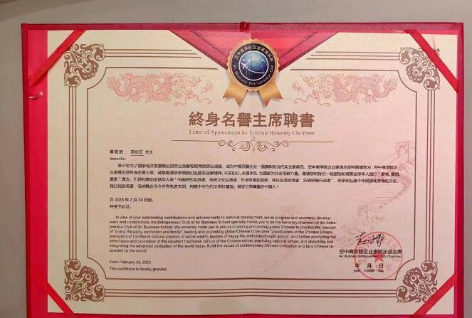宗庆后主席终身名誉主席聘书