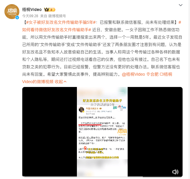 据@梧桐Video 报道,近日,安徽合肥。一女子因刚工作不熟悉微信功能,所以用文件传输助手时直接搜索出来两个,选择一个一用就是5年。最近女子发现自己所用的“文件传输助手”变成“文件传瑜助手”还发了两条朋友圈才注意到有问题,认为是好友改名且不告知本人故意偷窥自己的生活。当事人称用这个号传输过各种各样的数据和个人隐私等,期间还打过视频电话看自己的仪表,但他也没有接过。自己名下也未有贷款之类的犯罪行为。目前已经报警,但警方还没有更好的处理办法。联系微信客服也尚未有回复。希望大家警惕此类事件,提高辨别能力。