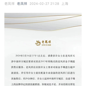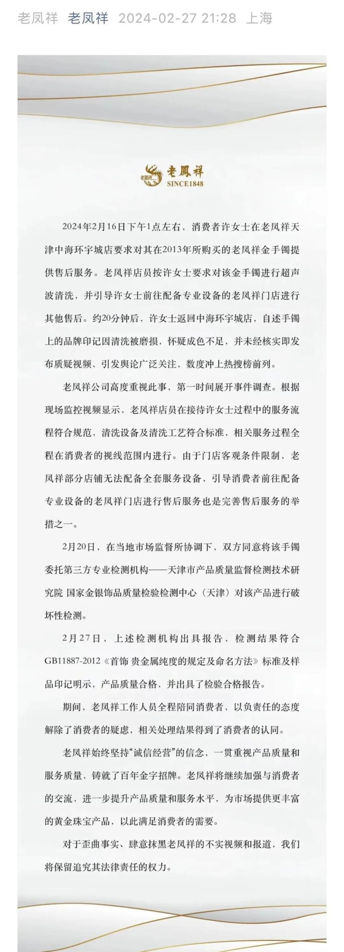 “老凤祥”在回应中说,2月16日下午1点左右,消费者许女士在老凤祥天津中海环宇城店要求对其在2013年所购买的老凤祥金手镯提供售后服务。老凤祥店员按许女士要求对该金手镯进行超声波清洗,并引导许女士前往配备专业设备的老凤祥门店进行其他售后。约20分钟后,许女士返回中海环宇城店,自述手镯上的品牌印记因清洗被磨损,怀疑成色不足,并未经核实即发布质疑视频,引发舆论广泛关注,数度冲上热搜榜前列。
