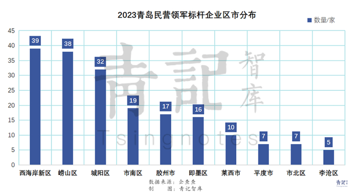 区域分布上,西海岸新区以39家的总量领跑全市,崂山区38家紧随其后。