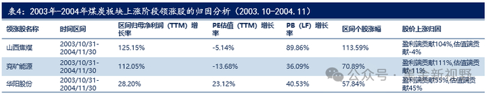 (1)在 2003年10月2004年11区间内,山西焦煤、兖矿能源、华阳股份取得了更高涨幅,区间内分别上涨了114%、71%、58%。通过股价上涨归因分析,我们发现,盈利端的提升显然对股价的贡献更为明显,符合我们对于板块的认知,尤其是山西焦煤与兖矿能源(当时名为西山煤电和兖州煤业),区间内归母净利润的提升达翻倍以上,而估值端则有所下降。华阳股份是一个例外,但其上涨幅度较前两家公司较为有限。
