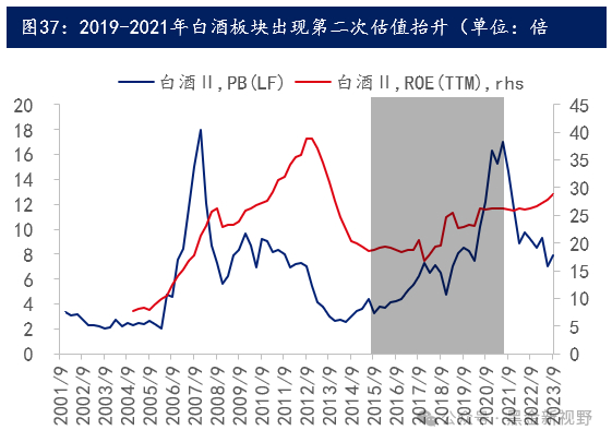 类似白酒板块在2016-2017年抬估值之后,2019-2021又出现了第二波抬估值,我们认为核心原因在于,2016-2017年白酒板块ROE上行速度较快,但市场认为白酒ROE上行驱动力来自于宏观经济回升带来的需求回升。2019-2020年宏观经济增速回落,但白酒ROE保持高位企稳,这一阶段市场资金认可了白酒的高ROE来自需求优化、消费升级带来的产业结构变化,理论上产业逻辑变化驱动的ROE的抬升更为稳定。此外,居民资金流入,强化了消费型基金的规模。2019-2021年,市场的主流风格是成长,消费板块既有价值风格的特征,也有成长性的逻辑。