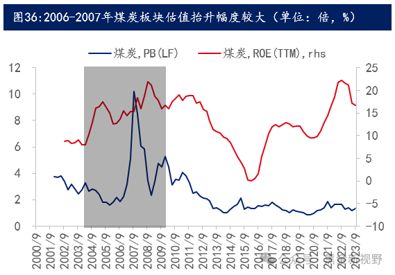 本轮煤炭行业景气周期仍处于早中期,现阶段类似2005-2006年,煤炭价格大幅上涨后带动煤炭公司盈利明显改善且ROE维持高位,板块上涨在经历盈利提升驱动后也有望进入进一步估值修复提升阶段。由于“十二五”以来的行业长期的资本开支下行低迷,自2020年4月起,使得煤炭供给端无法快速响应需求端持续增长,煤炭价格显著上涨,行业迎来新一轮景气周期。从资本市场表现看,煤炭板块整体迎来了明显的上涨(2020年4月以来申万煤炭板块超额收益+126%),分阶段看:2021年2月-2022年9月由煤炭公司盈利端的上涨所推动,反而板块估值端变化较小;2022年10月-2023年7月,煤炭供需错配出现阶段性宽松,煤炭价格明显下跌,煤炭板块波动回调,此间过度悲观预期下煤炭板块估值反而进一步压缩(以申万煤炭为例,PE最低位6.5倍,PB最低位1.2倍);自2023年8月以来,煤炭价格止跌企稳,煤炭公司ROE中枢底部抬升的确定性增强,叠加市场疲软下高股息资产得到青睐,驱动煤炭板块新一轮的上涨,取得了较好的超额收益。值得注意的是,从上一轮景气周期复盘来看,本轮煤炭板块上涨主要得益于煤炭产能周期下,盈利端ROE中枢抬升的驱动,而板块估值并未实质提升甚至阶段性有所收缩,尽管近期板块估值有所抬升,更多是前期过度悲观预期证伪后的底部修复,现阶段较类似于2005-2006年,尚未兑现板块估值提升驱动的上涨。