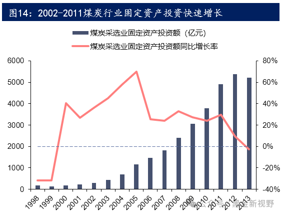 2002-2011年:煤炭黄金十年。1998年,随“关井压产”政策实施,我国共减少煤炭产能3.5亿吨,相当于当时煤炭产量的27.3%。而经济的快速增长带来了煤炭需求,尤其是2002年,中国加入WTO,GDP实现高增长,2003年,全国性的电荒在冬夏爆发两轮,多地“拉闸限电”。在2002年到2008年之间,经济的快速发展拉动了总需求,能源需求量随之增高,煤炭市场供不应求,煤炭价格在这段时间持续抬高。煤炭企业在高利润的驱动下,积极扩大投资增产,以满足市场缺口。煤炭行业投资增速在2005年达到了较高的69.64%。2006-2008年煤炭投资增速维持在25%左右。在2008年,虽然出口经济受到全球金融危机的冲击,但内需方面国家出台“4万亿投资计划”拉动消费与基建,国家经济增速虽然有一定降速,煤炭行业在2008年-2011年依旧保持了20%以上的固定资产投资增速。2012年,随经济降速,煤价下降,煤炭行业固定资产投资开始下滑,宣告了我国上一轮煤炭产能周期进入出清阶段。