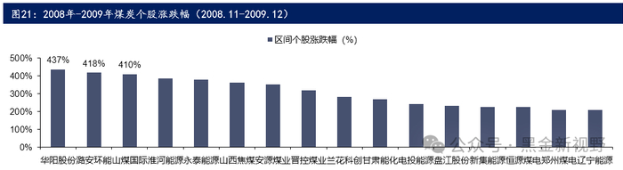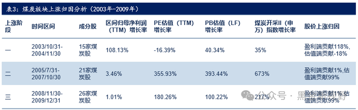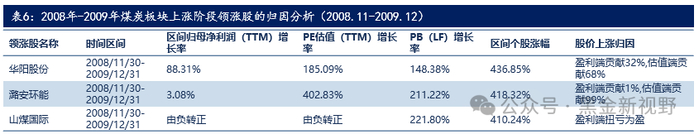 (3)在 2008年11月至2009年12月区间内,我们跟踪的26家煤炭公司,实现归属母公司股东净利润(TTM)同比上升1.01%,行业PE估值(TTM)均值从10.17倍提升到28.49倍,大幅提升了180.26%,对于该区间煤炭板块的上涨,盈利端贡献1%,估值端贡献99%,股价的上涨也主要是由估值端推动的。