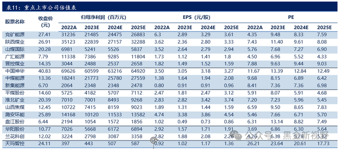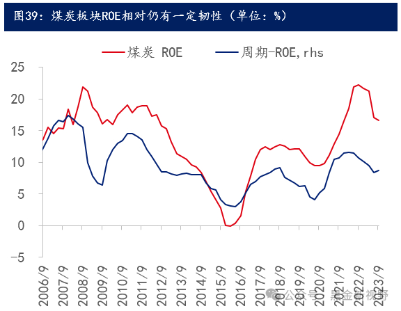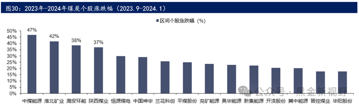 (2)2023年10月至2024年1月的区间,煤炭板块较万得全A指数具有明显超额收益,中煤能源、淮北矿业、潞安环能、陕西煤业等个股取得了更高涨幅,区间内分别上涨47%、42%、38%和37%。如上文所言,在这段时间内市场较为弱势,业绩稳定+高现金+高股息的煤炭公司成为了市场青睐的标的。例如中煤能源、陕西煤业等领涨股个股都属于长协比例较高的动力煤公司(中国神华涨幅排名第六),尽管23年煤价中枢较22年有所回调,但公司业绩仍保持相对稳定。同时,中煤能源由于历年资产减值问题,估值一直处于相对低位,而2023年随新增矿井释放产能,叠加减值规模有望缩减,业绩有较明显改善预期,上涨也包括了估值端的修复;陕西煤业则作为资产优质的纯煤炭龙头,常年业绩稳定且维持高分红,与中国神华类似在煤炭板块内有较高辨识度。而潞安环能、淮北矿业作为冶金煤公司,虽然冶金煤价格弹性较大,但在2023年煤价下行的情况下公司业绩方面表现稳定。因此,我们认为在本轮煤炭板块的超额收益阶段中,尽管至今没有较为显著的公司公告口径的业绩变化,但符合“ROE中枢抬升”这一概念,即业绩端更为稳定的公司表现更好。