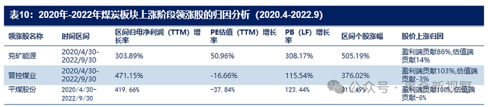 (1)在2020年4月至2022年9月的时间段内,兖矿能源因公司动力煤长协比例较低,表现出较大的弹性,且内生外延增长空间较大,其业绩充分受益于煤价的上涨。公司从业绩到估值均呈现明显增长,迎来了戴维斯双击,成为了该上涨区间的领涨股,并且涨幅领先较为显著。而晋控煤业受益于业绩大幅改善,同时山西煤炭国企重组也使公司获得了较强的资产注入预期。总体而言,各公司在业绩端都表现出较为明显的提升,其股价上涨主要受益于盈利改善。