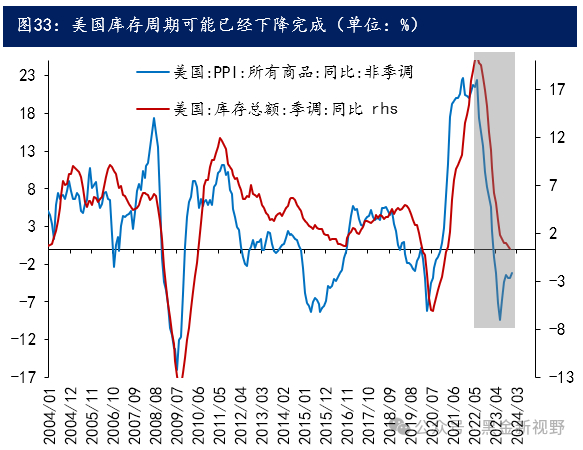 中美库存周期均已在底部附近。2000年以来,国内经济周期中最弱的一次库存周期是2012年中到2014年初的库存周期。而这段时期工业企业利润增速、上市公司ROE均出现过一定幅度的反弹。本轮库存周期下行从2021年6月开始,已经持续18个月,持续时间已经超过历史平均水平。2023年7月起库存周期有触底迹象,表现为PPI小幅回升,工业企业产成品存货低位企稳。