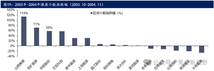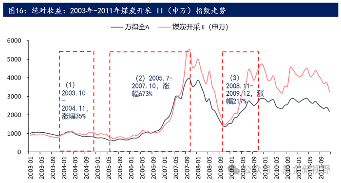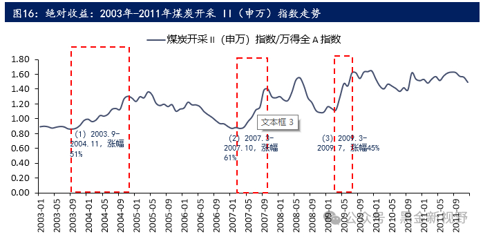 (1)2003.9-2004.11,时间跨度1年零2个月,相对指数(煤炭开采II(申万)/万得全A)从0.86点涨到1.30点,涨幅高达51%;