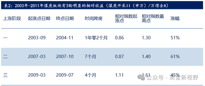 2003年-2011年,煤炭板块一共有3轮明显的相对收益阶段,分别是: