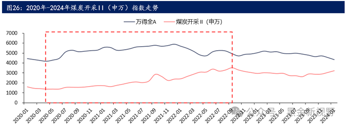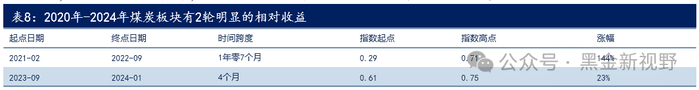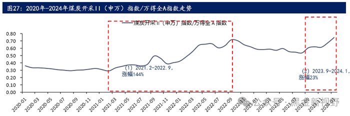 (2)2023.9-2024.1,时间跨度4个月,相对指数(煤炭开采II(申万)/万得全A)从0.61点涨到0.75点,涨幅高达23%。