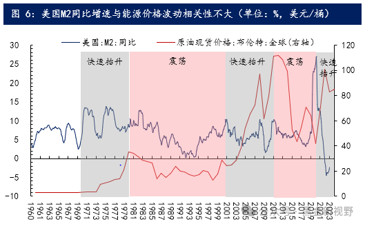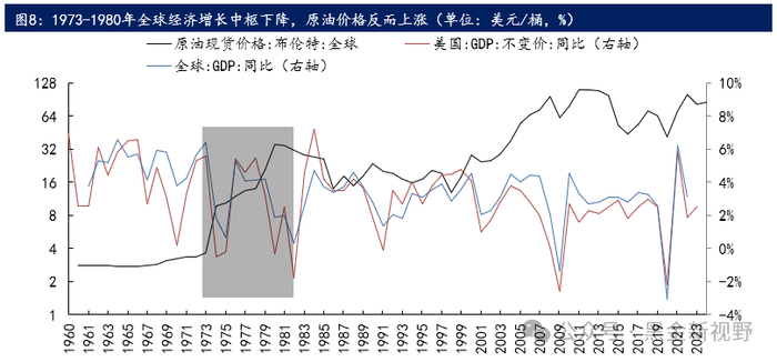 但从5-10年的维度看,能源价格波动和需求波动也存在不匹配的情况。例如,1960-1970年是全球经济增速较高的阶段,但此期间,能源价格大部分时间都是维持低位波动。1973-1982年全球经济开始增长乏力,出现增长中枢下台阶,而此时原油价格却出现了大幅的上涨。