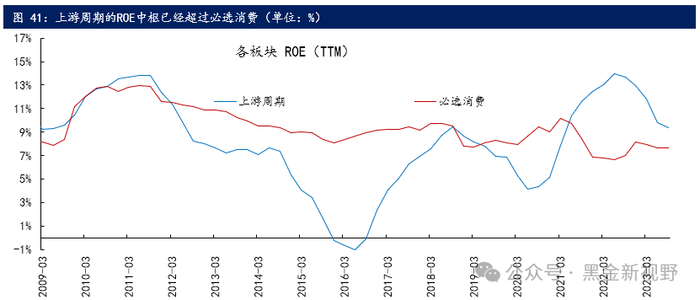 但这一次红利指数的行业分布和之前有较大不同,煤炭行业占比大幅提升。从2020年开始,煤炭行业在红利指数中的占比快速提升。市值占比从2019年的3.69%快速提升到2023年的24.12%,由此成为红利指数中权重最高的一级行业。这与之前的银行、交运、公用事业等板块有很大的不同,银行、交运、公用事业等行业是“ROE稳定+高分红”。但煤炭的ROE并不是很稳定,只是由于最近几年产业格局的变化,煤炭以及其他上游周期的ROE中枢的系统性抬升,现在甚至已经超过了必选消费的ROE。所以煤炭是“ROE中枢抬升+高分红”,其背后既有公用事业类的高分红,也有之前必选消费ROE抬升阶段的较大预期差。