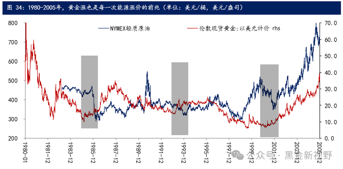 这一现象,不只是最近几次周期的特征,我们可以观察1980-2005年,历次产能周期中,黄金价格都是领先能源价格上涨的,领先的时间大多在半年到一年之间。我们的判断是2024年内可能会是新一轮能源价格上行周期的起涨点。