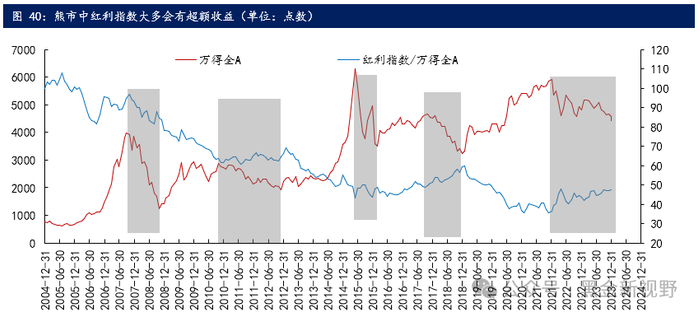 高股息策略历史上并不是投资的主流策略,其超额收益大多会出现在熊市中。2008年、2011-2012年、2015下半年-2016年初、2018年、2022-2023年,在这几次熊市中,红利指数只有2008年没有超额收益。而且大部分情况下,熊市一旦结束,红利指数的超额收益均会开始走弱。在牛市中有超额收益的案例只有两个,分别是2006年9月-2007年10月和2016-2017年。