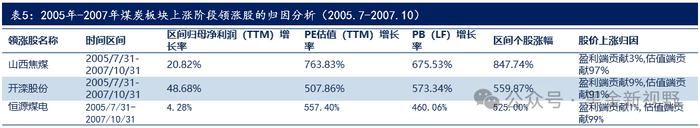 (2)在 2005年7月至2007年10月区间内,我们跟踪的21家煤炭公司,实现归属母公司股东净利润(TTM)同比上升3.46%,行业PE估值(TTM)均值从12.84倍提升到58.55倍,大幅提升了355.93%,该区间煤炭板块的上涨主要是由估值端推动的。