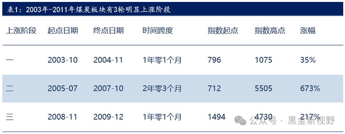 复盘2003年-2011年煤炭板块的表现,绝对收益方面,共有3轮明显的上涨(未考虑下跌周期中的短期反弹),分别是: