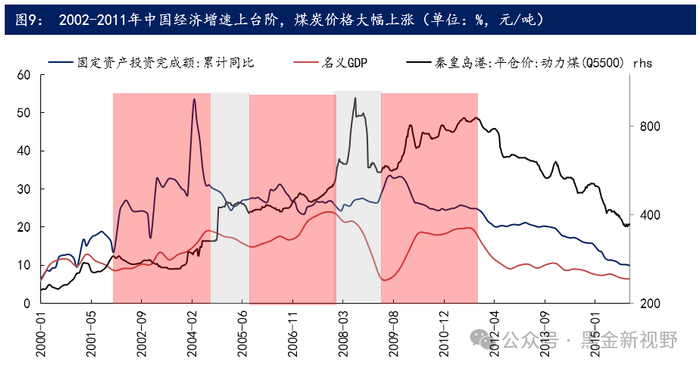 2002-2011年近10年的时间里,受益于工业化的快速发展,中国经济增长中枢进入稳定上台阶的时期,煤炭价格大幅上涨。2002-2011年中国GDP复合增速达到14.9%,名义GDP当季增速从2001Q4的8.34%提升到2007Q4的23.65%的高点,工业增加值当月同比增速中枢为15.4%,固定资产投资完成额累计同比增速中枢为26.8%,经济增长较为强劲。在此期间,由于需求的快速上升,供给不足的问题也逐渐凸显,煤炭价格从2002年到2011年底的高点涨幅达到197%。需注意的是,2002-2011年中国经济也有两次短周期下行,分别是2004Q2-2005Q3和2008年。库存周期下行时期,煤炭价格都出现了下跌。但库存周期的短期波动并未改变由于产能周期向上带来的煤炭价格上涨的长期趋势。