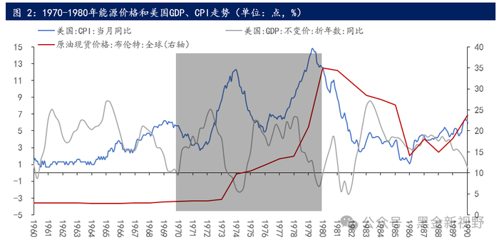 两次石油危机的爆发带来的供给短缺是能源价格大幅抬升的催化剂。1973年10月第一次石油危机爆发,又给经济带来了较大的通胀压力。美国GDP增速在1973Q1到1975Q1从7.56%下降到-2.3%。由于通胀问题仍然严重,美联储货币政策以加息为主,宏观经济滞胀状态下,需求端并不强,但由于第一次石油危机造成供给紧缺,能源价格在1973-1974年大幅上涨188%。1979年第二次石油危机导致美国经济再次陷入滞涨和衰退。1979Q1之后美国GDP增速在高位开始快速回落,由年初的6.5%大幅下降至1982Q3的-2.56%,而能源价格在1979-1980年大幅上涨152%。