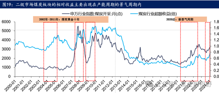 资料来源:IFIND,信达证券研发中心,注:橙色区域为煤炭产能周期景气周期时间段,虚线框范围内为超额收益时间段。