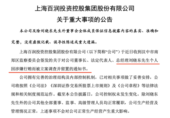 2月27日晚间,百润股份披露一则重大事项公告,称公司于近日收到汉中市南郑区监察委员会签发的关于对公司董事长、法定代表人、总经理刘晓东个人因涉嫌行贿而被立案调查并留置的通知书。
