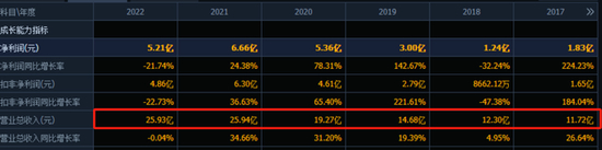 2018年至2022年,百润股份的实现营业收入分别为12.30亿、14.68亿、19.27亿、25.94亿、25.93亿,同期净利润为1.24亿、3亿、5.36亿、6.66亿、5.21亿。