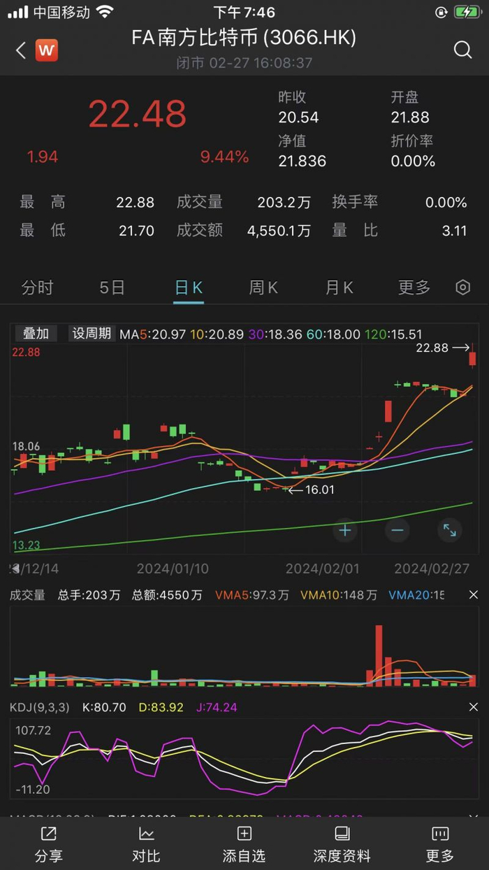 公开资料显示,该基金是南方基金子公司南方东英资产管理旗下产品,2022年12月在港交所上市交易。南方东英官网显示,截至2月22日,该基金规模超过8800万美元,主要投资于芝商所的比特币期货。Wind数据显示,南方东英比特币期货ETF2023年净值涨幅高达134.51%。