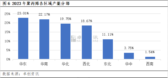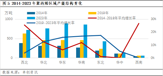 2019-2023年,聚丙烯产能逐步向沿海消费区域转移,华北、华东、华南区域扩能提速,期间产能增长率分别达到12.50%、15.91%、16.84%。而西北地区随着煤化工投产高峰期结束,产能增长明显放缓,2019-2023年平均增长率仅为3.73%。
