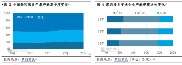 近几年国内聚丙烯以炼化一体化装置以及轻烃装置为主的民营企业快速涌入市场,生产规模呈现大型化发展趋势,单套规模在40-60万吨/年的装置明显增多。2023年国内已有7家企业产能突破100万吨,小规模生产企业发展逐步压缩,行业的规模化布局逐步展开。